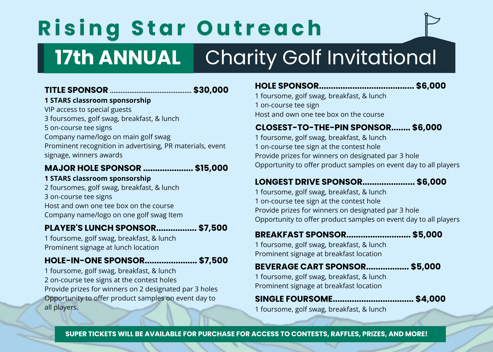 Thank you for supporting Rising Star Outreach through our 2026 Golf Tournament at Red Ledges! Select your sponsorship or player package below to complete your registration.